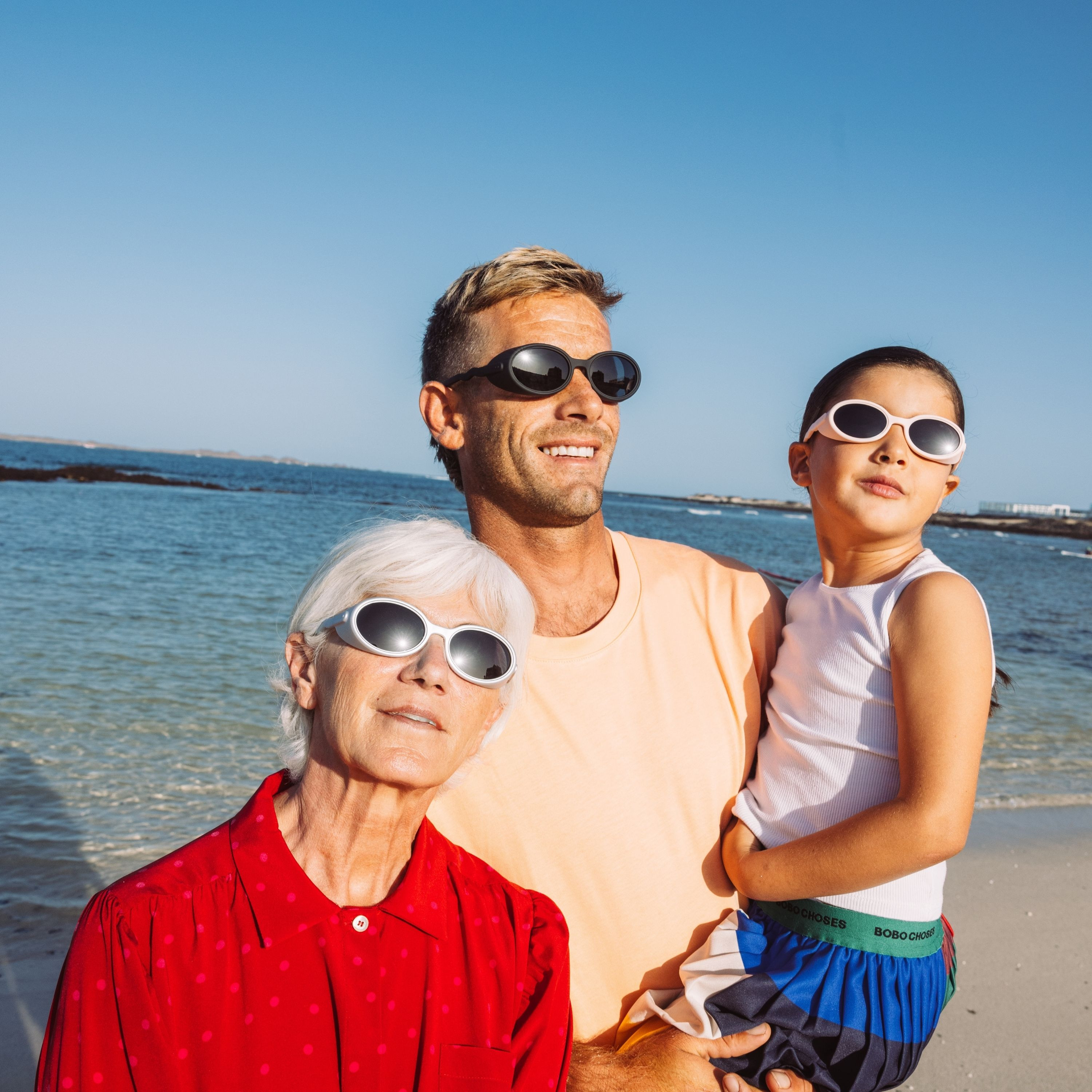 Sunglasses designed with an iconic wavy temple resembling an ocean wave, culminating in a soft-ring tip for attaching our creative accessories.